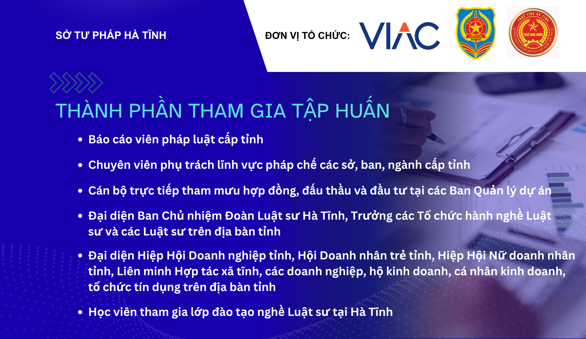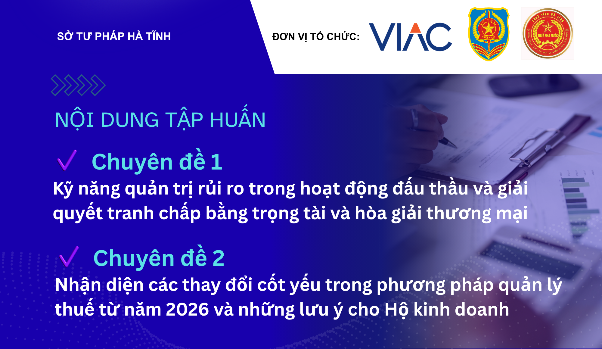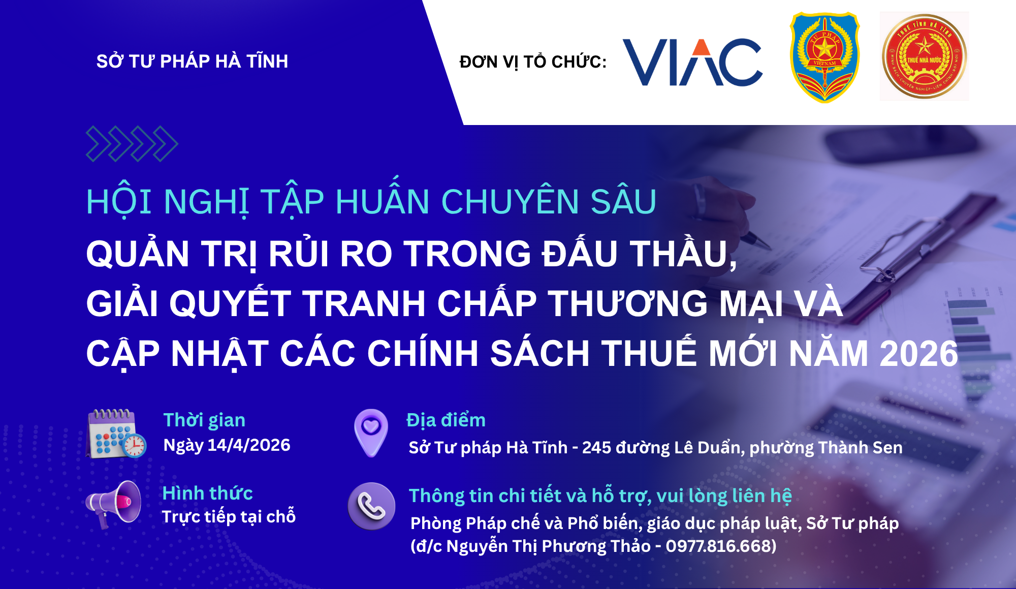 Nhằm nâng cao năng lực pháp lý cho đội ngũ cán bộ pháp chế, luật sư và cộng đồng doanh nghiệp trên địa bàn tỉnh, Sở Tư pháp Hà Tĩnh phối hợp với Trung tâm Trọng tài Quốc tế Việt Nam (VIAC) và Thuế tỉnh Hà Tĩnh tổ chức Hội nghị tập huấn chuyên sâu với chủ đề "Quản trị rủi ro trong đấu thầu, giải quyết tranh chấp thương mại và cập nhật các chính sách thuế mới năm 2026" vào ngày 14/4/2026, tại Hội trường Sở Tư pháp Hà Tĩnh, số 245 đường Lê Duẩn, phường Thành Sen, tỉnh Hà Tĩnh.