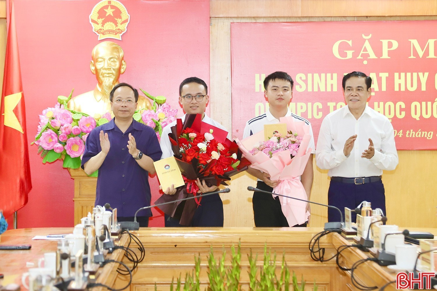 Bí thư Tỉnh ủy Nguyễn Duy Lâm, Chủ tịch UBND tỉnh Võ Trọng Hải tặng hoa chúc mừng em Trần Minh Hoàng (đứng thứ 2 từ trái qua) và em Võ Trọng Khải đoạt Huy chương Vàng Olympic Toán học quốc tế năm 2025.