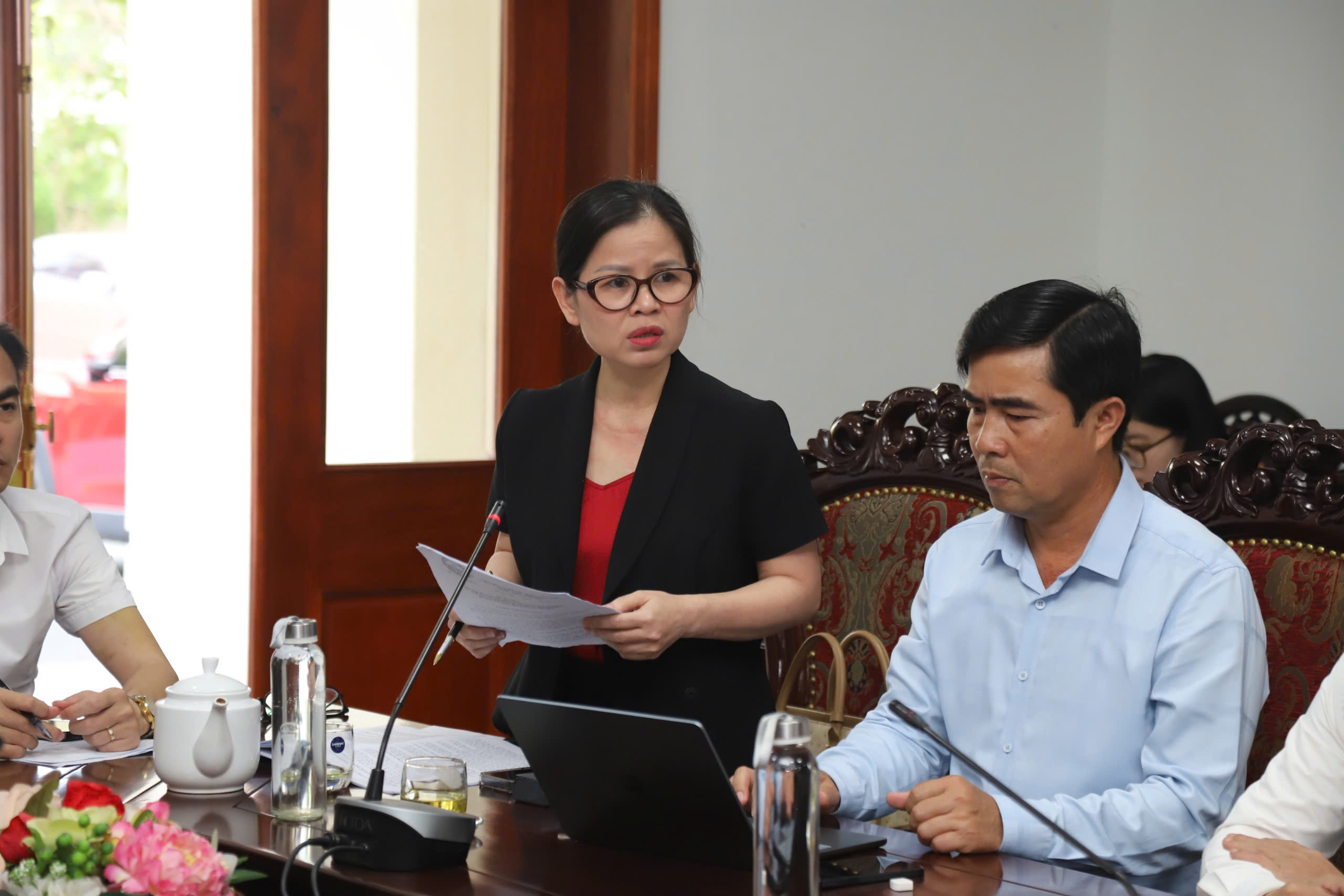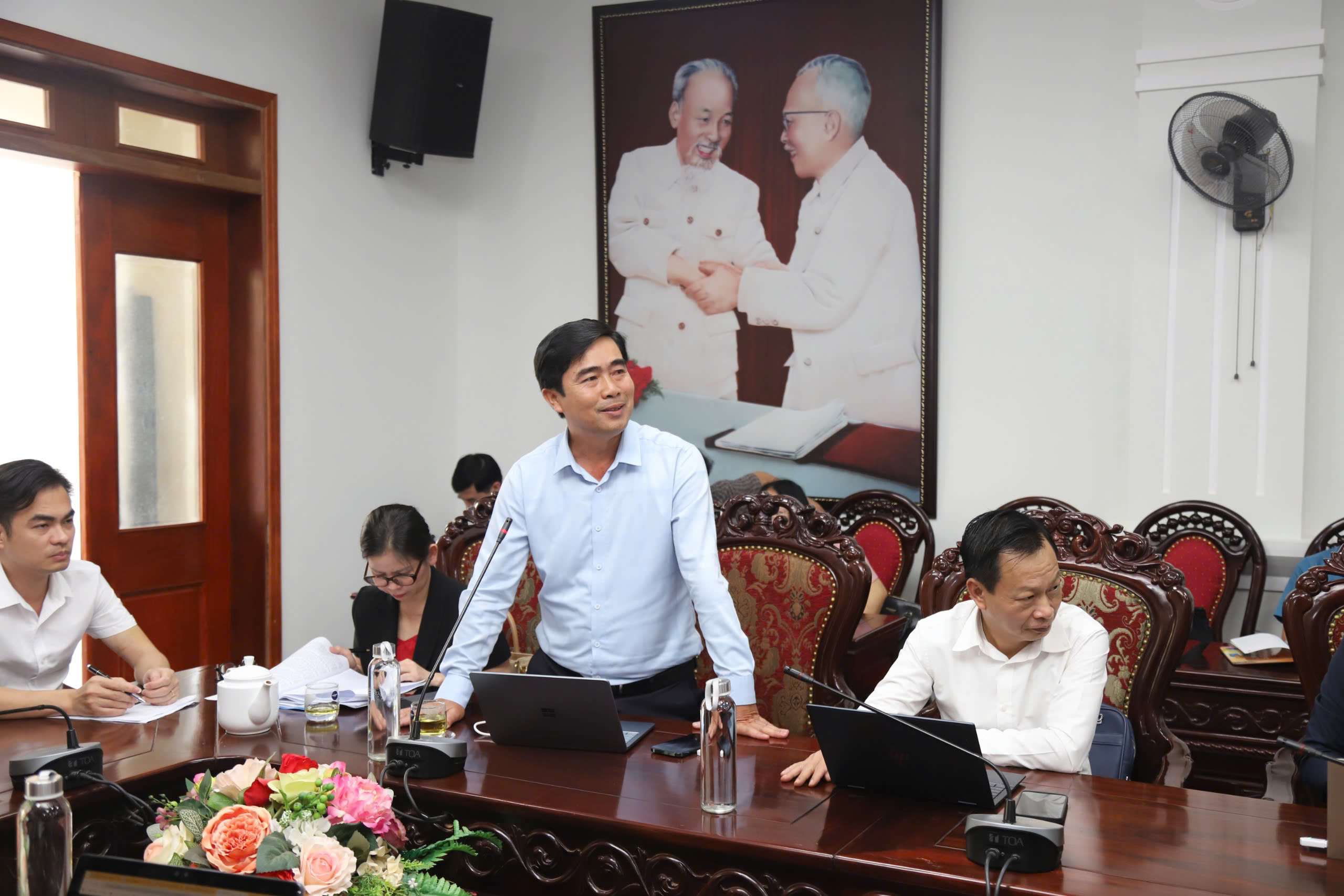 Đồng chí Nguyễn Quốc Tuấn - Tỉnh ủy viên, Giám đốc Sở Tư pháp báo cáo khái quát tiến độ xây dựng và những nội dung cơ bản của dự thảo Đề án